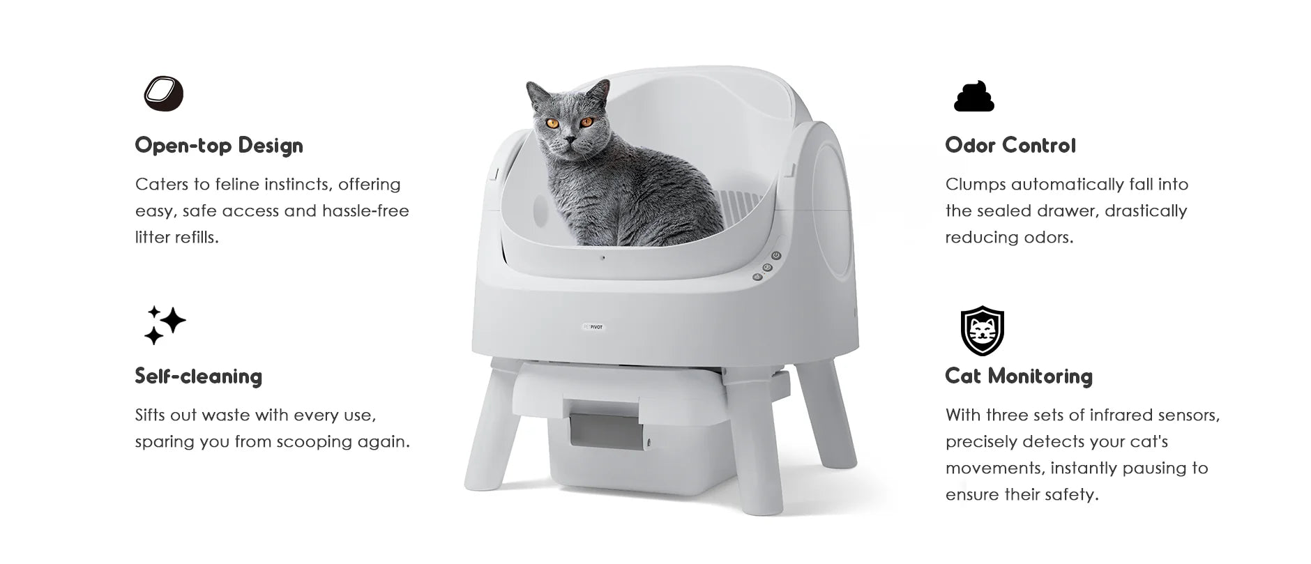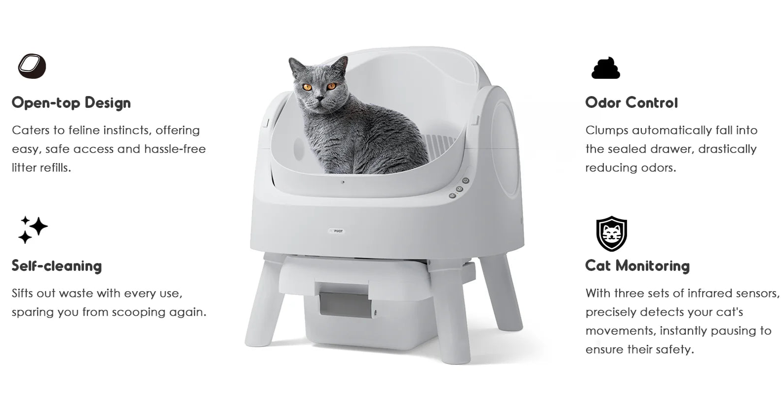 The Autoscrooper 11 cat litter box is equipped with two sets of infrared sensors, precisely detecting your cat's movements. Instantly pausing operation upon detecting a cat's presence, it prioritizes your kitty's safety.